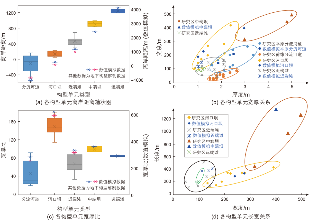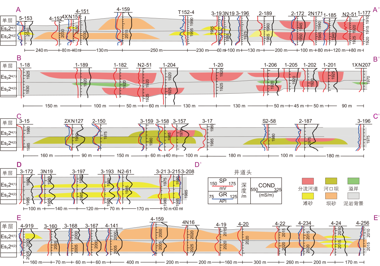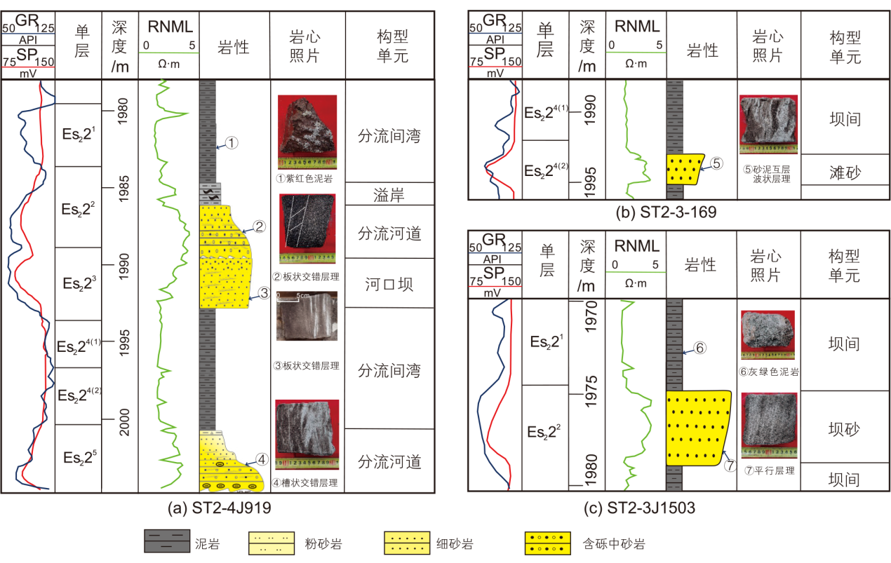 浅水三角洲广泛发育于湖泊环境中,受到波浪的改造作用,可在其前端形成离岸滩坝沉积。湖盆浅水三角洲-离岸滩坝体系可作为重要的油气储层类型,其构型特征尚不清楚。本文综合利用岩心与密井网资料,对渤海湾盆地东营凹陷胜坨油田二区沙河街组二段2砂组砂体开展了精细构型解剖,结合基于Delft3D的沉积数值模拟结果,阐明了湖盆浅水三角洲-离岸滩坝体系构型特征与形成机理。研究认为,浅水三角洲-离岸滩坝体系在顺源方向上具有明显的相带分异特征,呈现浅水三角洲前缘-小规模滩砂-大规模坝砂-小规模滩坝砂的顺源演变规律。浅水三角洲前缘与大规模的离岸坝砂同时形成,两者之间发育后期形成小型滩砂。浅水三角洲前缘表现出波浪影响的特点,分流河道分支数量少、深切于河口坝中部,河口坝呈朵状,分流河道在前进到一定距离后决口在侧向形成新的河口坝。大规模透镜状的厚层坝砂形成于破浪带附近,最先发育于三角洲的侧前方滩砂两侧部位,由两个小型坝砂生长、拼接而成,具有平面双厚中心、剖面驼峰状的特点。河口坝与大规模坝砂的规模相对较大、宽厚比高,前者的长宽比较低,而后者的长宽比较大;近端与远端滩砂的规模较小,长宽比与宽厚比也较小。本文研究为东营凹陷胜坨油田剩余油的精细挖潜提供参考和借鉴。