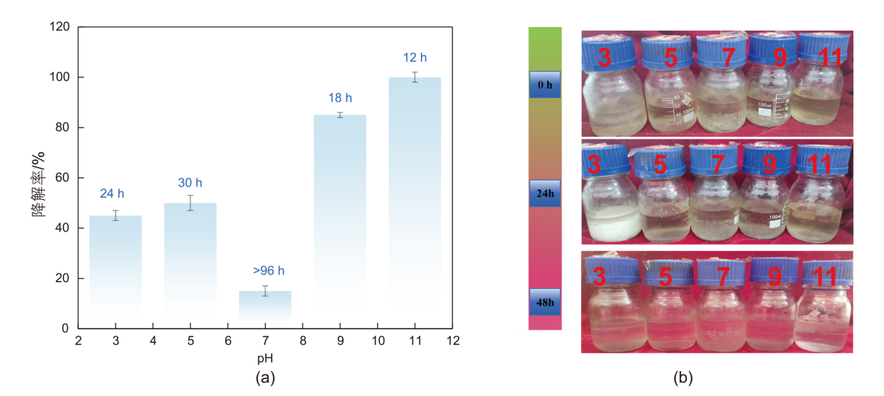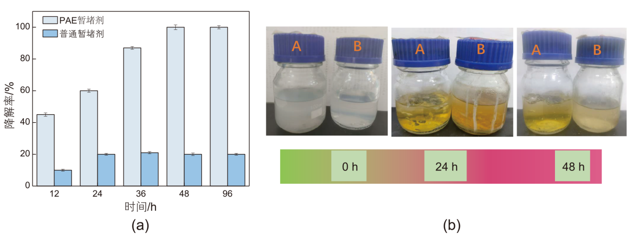 To address the challenges of conventional temporary plugging agents in oilfield development, such as inefficient gel breaking at later stages, prolonged degradation time, low gel strength, and significant permeability damage caused by residues, this study developed a self-degrading nano-composite gel temporary plugging agent (PAE) based on a physicochemical cross-linking strategy. The PAE was synthesized via free radical polymerization in aqueous solution using acrylamide (AM), acrylic acid (AA), polyethylene glycol diacrylate (AE), and hydrophobic monomer stearyl methacrylate (SMA), with nano-silica (SiO₂) incorporated to reinforce the cross-linked network. The effects of cross-linker (MBA) dosage, hydrophobic monomer content, initiator (APS) concentration, and temperature on gelation time and strength were systematically investigated. The degradation behavior of PAE under varying temperatures (70-120 ℃), pH (3-12), and salinity (20-50 g/L) was elucidated. Characterization techniques including Scanning Electron Microscopy (SEM), Fourier-Transform Infrared Spectroscopy (FTIR), and Thermogravimetric Analysis (TGA) were employed to analyze the microstructure, chemical composition, and thermal stability of PAE. Experimental results demonstrated that under the optimized conditions (monomer concentration 8%, APS 0.2%, SMA 0.4%, and temperature 70 ℃), PAE exhibited controllable gelation time (30-120 min) and formed a dense three-dimensional network with a gel strength of grade 9 (no deformation upon inversion). The degradation time of PAE ranged from 3 to 10 h at 70-120 ℃, with post-degradation viscosity below 10 mPa·s, significantly outperforming conventional agents (>96 h). Sand-packed tube tests revealed a breakthrough pressure gradient of 1.870 MPa/m and a plugging efficiency exceeding 90%. Core flooding experiments confirmed a permeability recovery rate above 90% after gel breaking, indicating minimal formation damage. Mechanistic studies revealed that the high plugging strength of PAE originated from the synergistic enhancement of physicochemical dual-crosslinking networks and nano-SiO2, while self-degradation was achieved through ester bond saponification under alkaline conditions and dissociation of hydrophobic association networks. This research provides a theoretical foundation and technical solution for developing high-performance, environmentally friendly temporary plugging agents in oilfield applications.