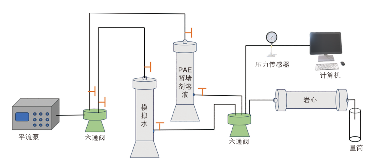 针对油气田开发中传统暂堵剂在封堵后期破胶困难、降解时间长、成胶强度低及残留物对地层渗透率损伤大等问题,本研究通过物理化学交联策略,设计并合成了一种基于纳米复合材料的自降解凝胶暂堵剂(PAE)。通过水溶液自由基聚合法,将丙烯酰胺(AM)、丙烯酸(AA)、聚乙二醇二丙烯酸酯(AE)与疏水单体甲基丙烯酸十八烷基酯(SMA)共聚,并引入纳米二氧化硅(SiO2)增强交联网络。系统探究了交联剂(MBA)、疏水单体含量、引发剂(APS)浓度及温度对凝胶时间与强度的影响规律,揭示了温度(70~120 ℃)、pH(3~12)及矿化度(20~50 g/L)对PAE降解行为的调控机制。通过扫描电镜(SEM)、傅里叶变换红外光谱(FTIR)和热重分析(TGA)表征了PAE的微观形貌、化学结构与热稳定性。实验结果表明:在优化条件下(单体浓度8%、APS 0.2%、SMA 0.4%、温度70 ℃),PAE成胶时间为30~120 min,形成致密三维网络结构,凝胶强度达9级(颠倒无变形);其在70~120 ℃环境中的降解时间为3~10 h,降解后粘度低于10 mPa·s,显著优于传统暂堵剂(>96 h)。填砂管实验显示,PAE突破压力梯度为1.870 MPa/m,封堵率>90%;岩心驱替实验表明,破胶后渗透率恢复率>90%,验证了其对地层的低伤害特性。机理分析表明,PAE的高强度封堵源于物理—化学双交联网络与纳米SiO2的协同增强作用,而自降解行为则通过碱性条件下酯键皂化与疏水缔合网络解离实现。本研究为油田高效环保型暂堵剂的开发提供了理论支撑与技术方案。